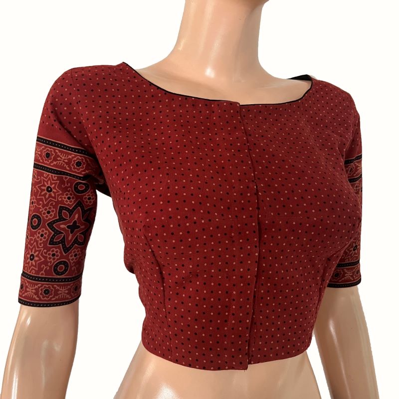 Ajrakh Cotton Boat Neck Blouse With Keyhole Back, Maroon , BA1170