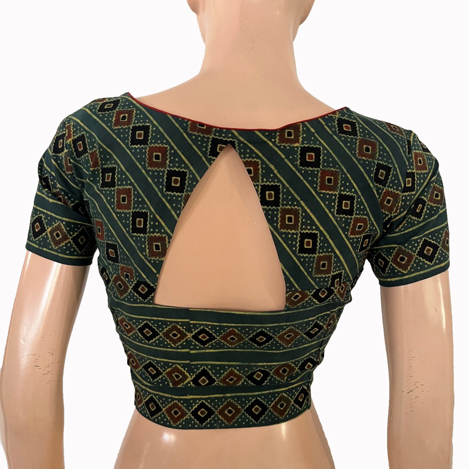Ajrakh Cotton Sweetheart neck Blouse, Bottle Green, BA1102