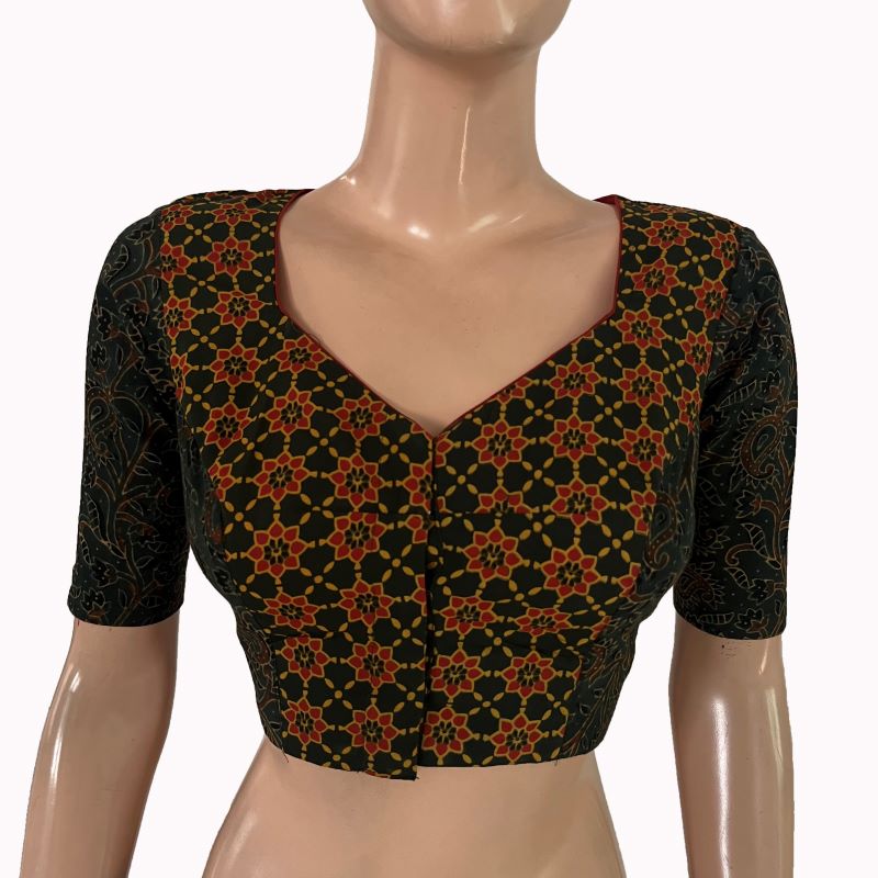 Ajrakh Cotton Sweetheart Neck Blouse, Bottle green- Orange, BL1009