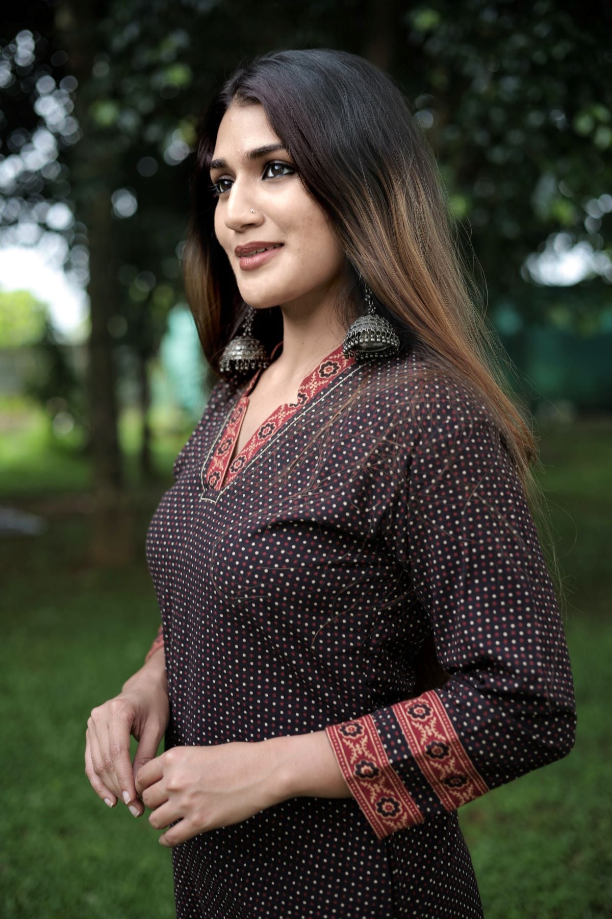 Ajrakh Cotton V Collar A Line Kurta, Black, KA1029