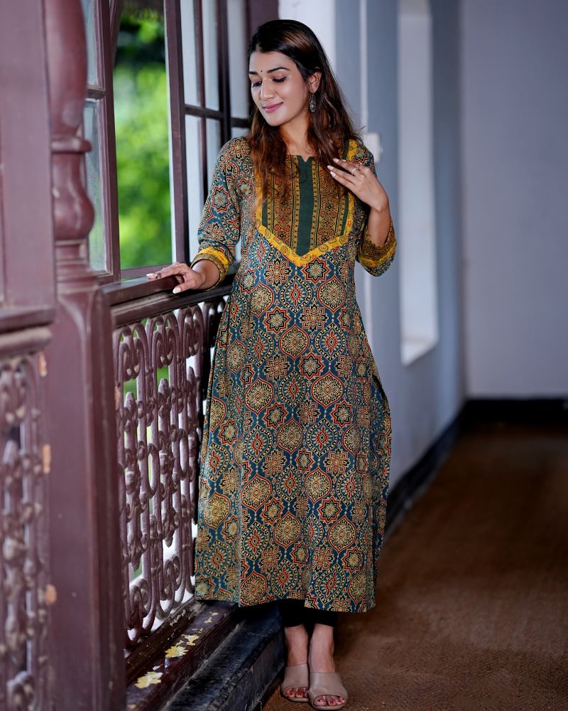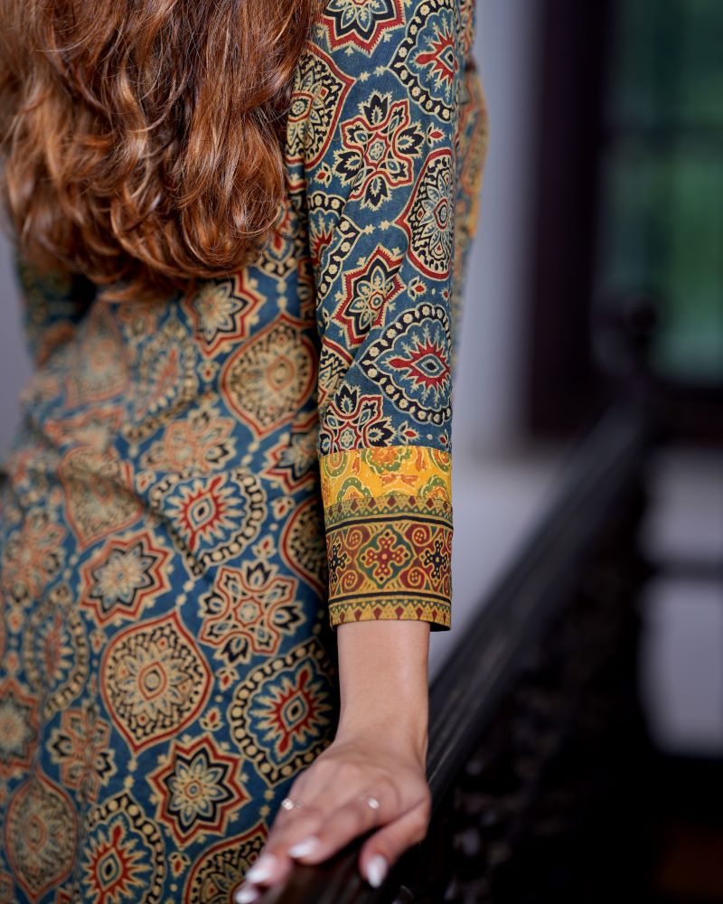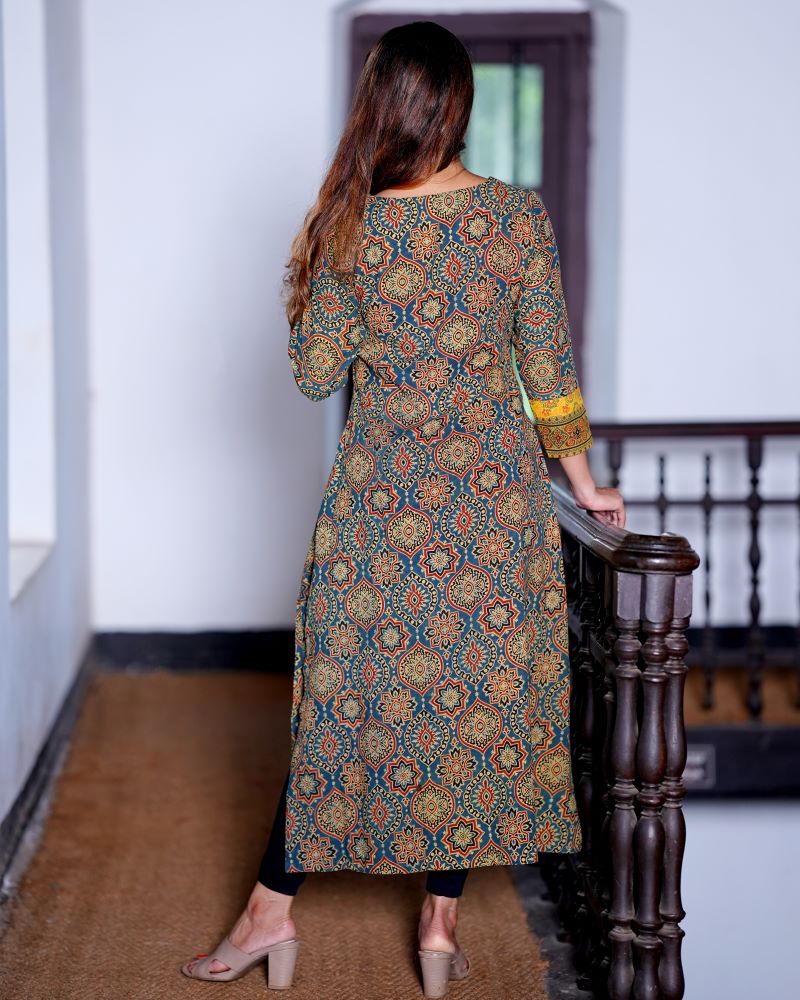 Ajrakh Cotton Y neck Straight cut Kurta with 3/4 Sleeves , Bottle Green, KA1028