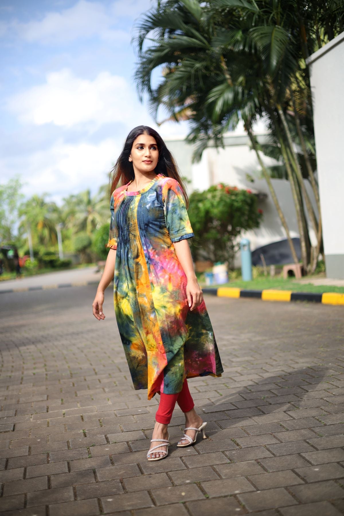 Bathik Cotton A Line Kurta with Pintuck and Half Sleeves, Multicolor, KP1090