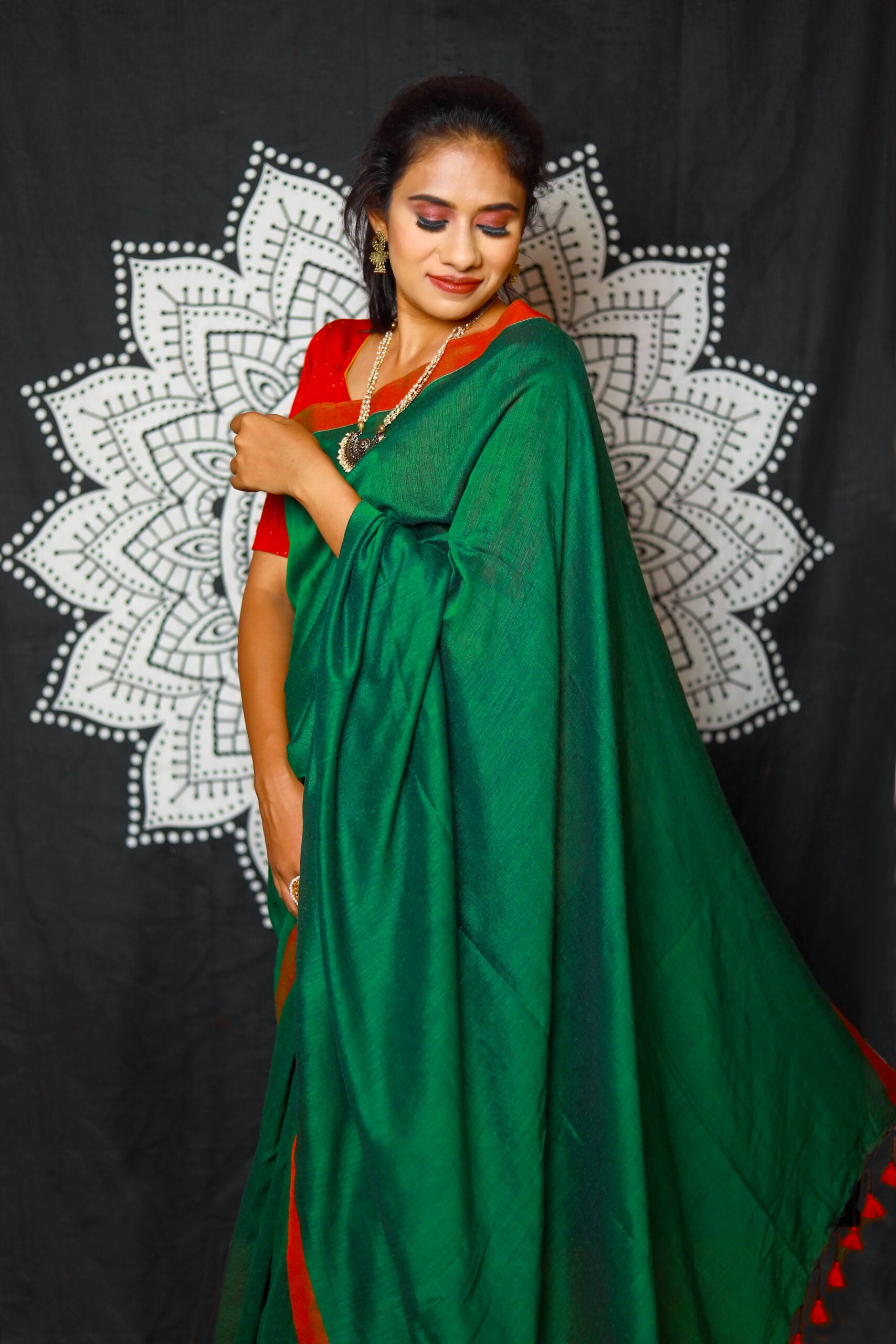 Handloom Soft Cotton Dual Tone Saree with Tassles, Bottle Green, SR1021