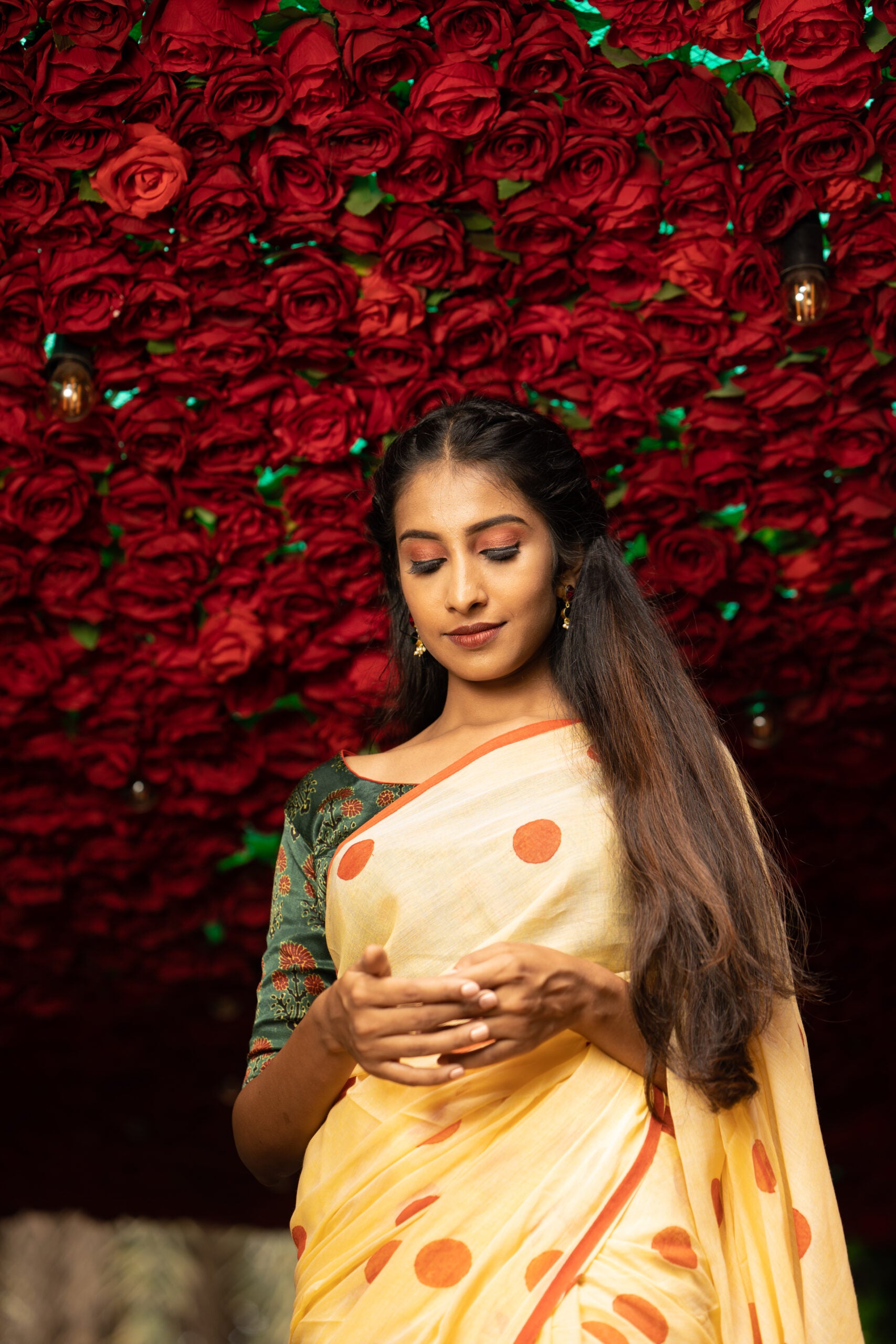 Handloom Soft Cotton Saree with Block Prints & Tassles, Cream, SR1005