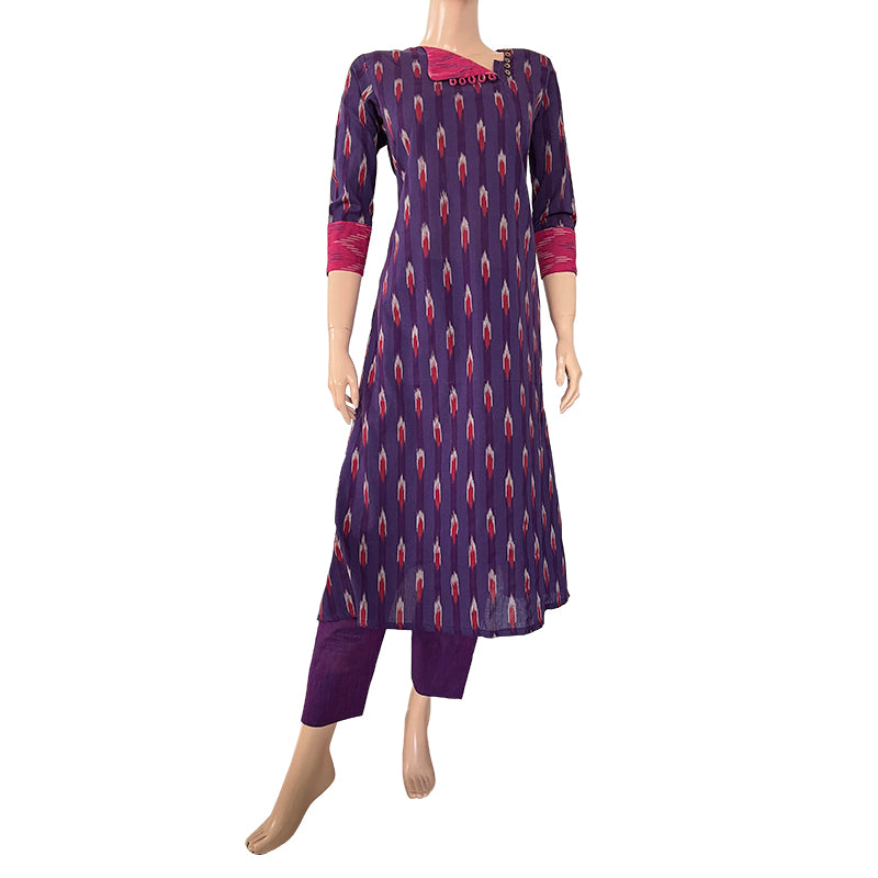 Ikat Cotton A line Kurta with Triangular Neck & Wooden Button Details, Purple, KI1022