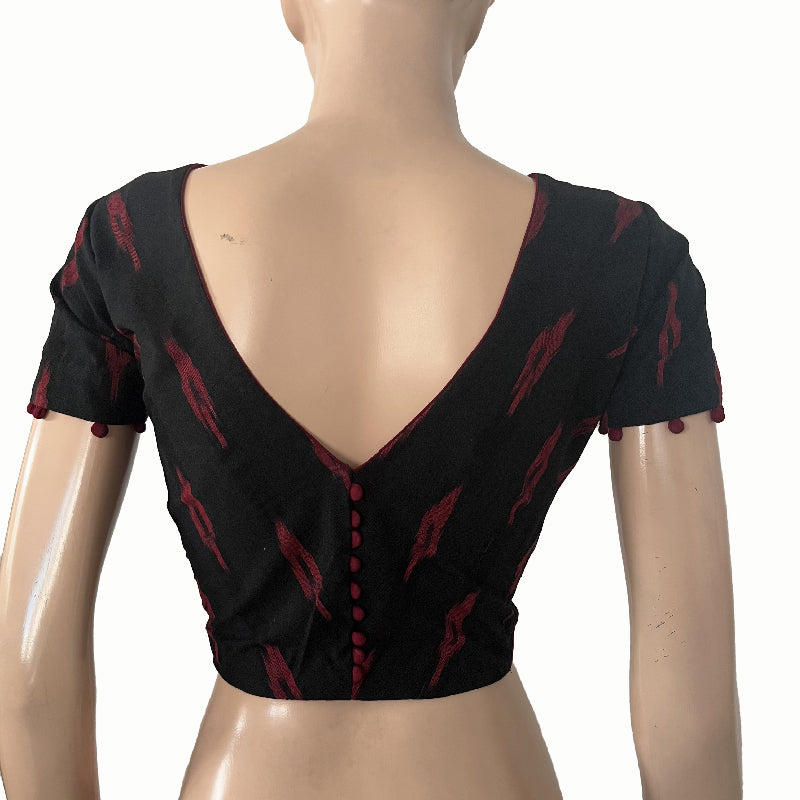 Ikat Cotton Boat neck Blouse with V neck Back & Potli Button Details Black, BI1164