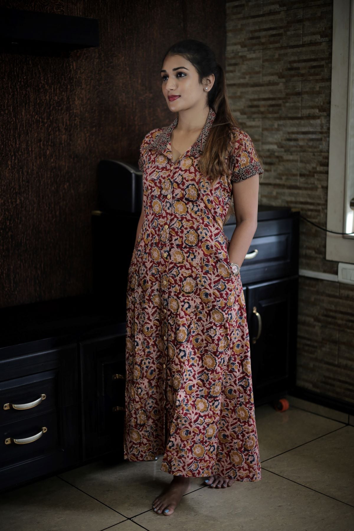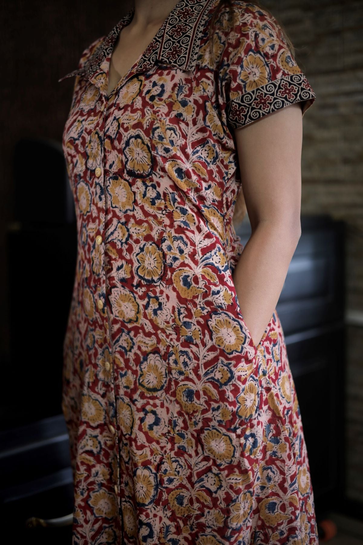 Kalamkari Cotton A line Shirt Collar Kurta with Wooden Button Details & Mega Sleeves, Maroon, KK1091