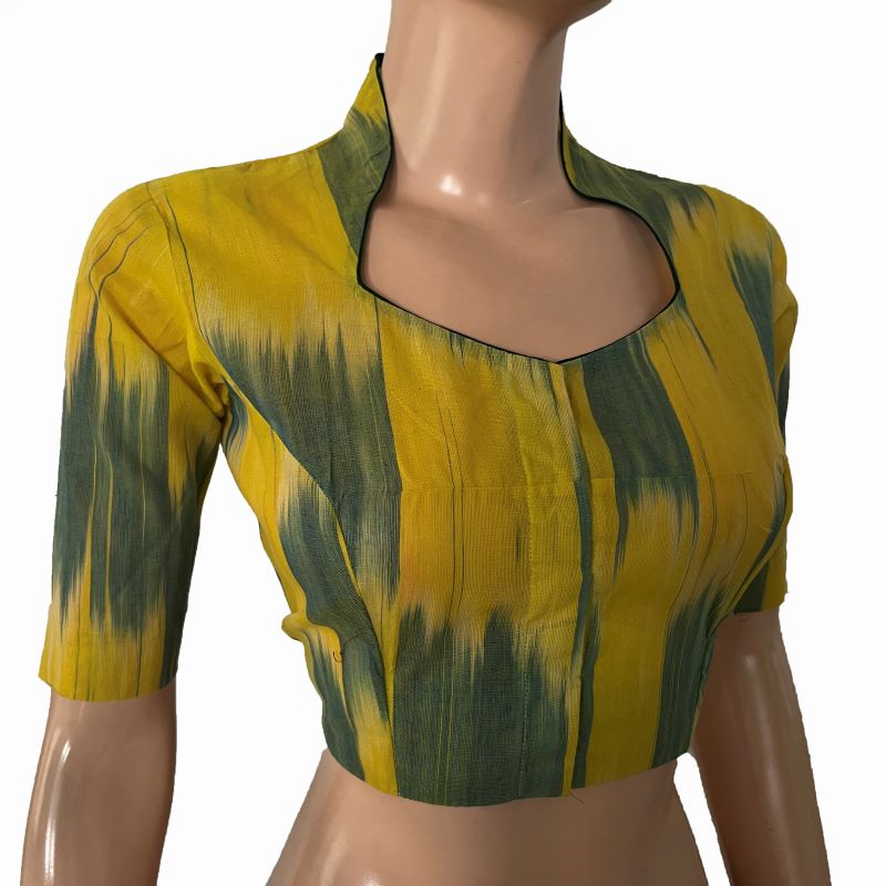 Mangalagiri Tie-dye Cotton High neck Blouse , Yellow- Green , BH1292