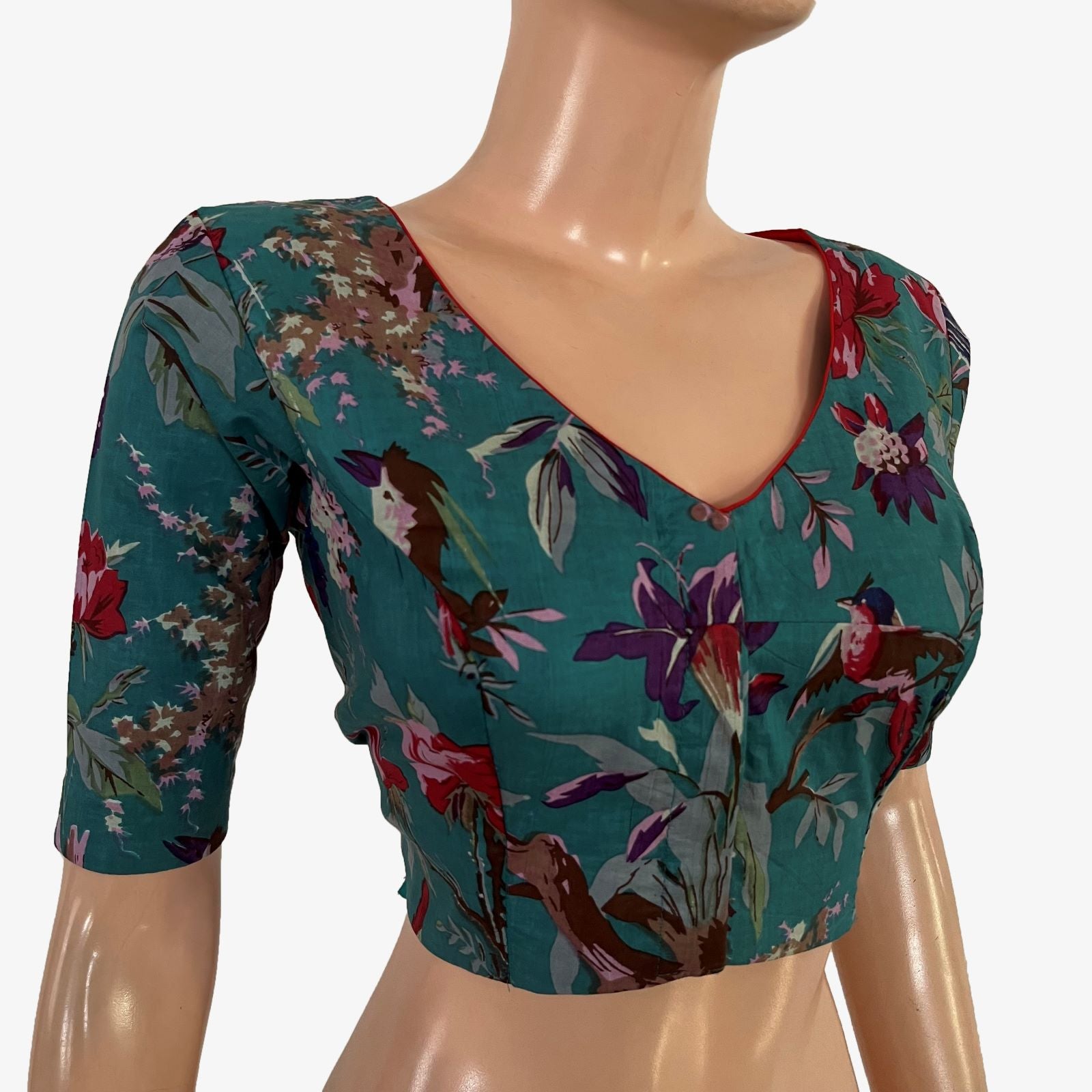 Printed Cotton V Neck Blouse ,Teal Blue, BP1219