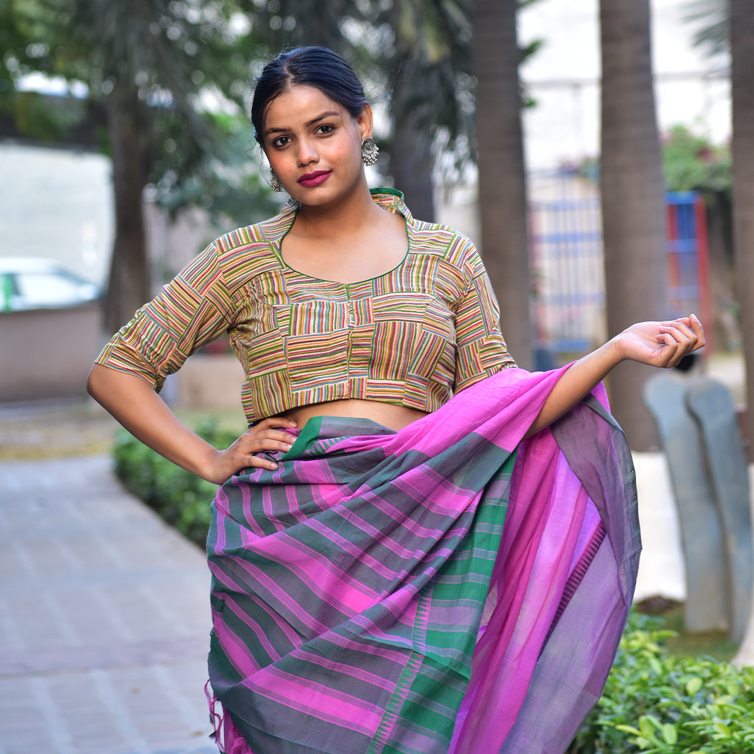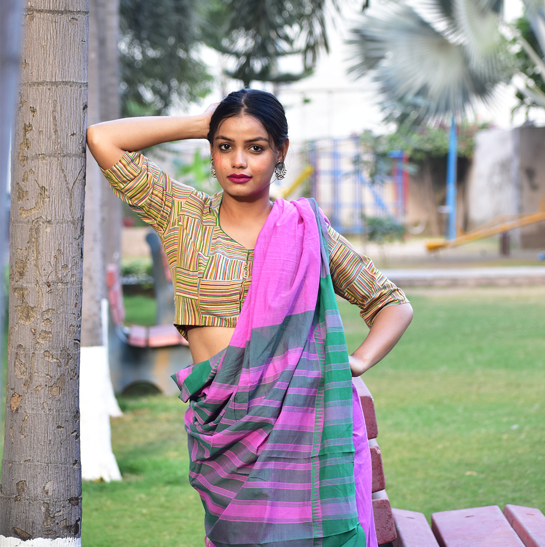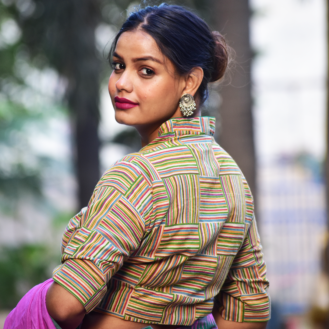 - Block Printed Cotton Striped Highneck Blouse, Olive Green, BP1181