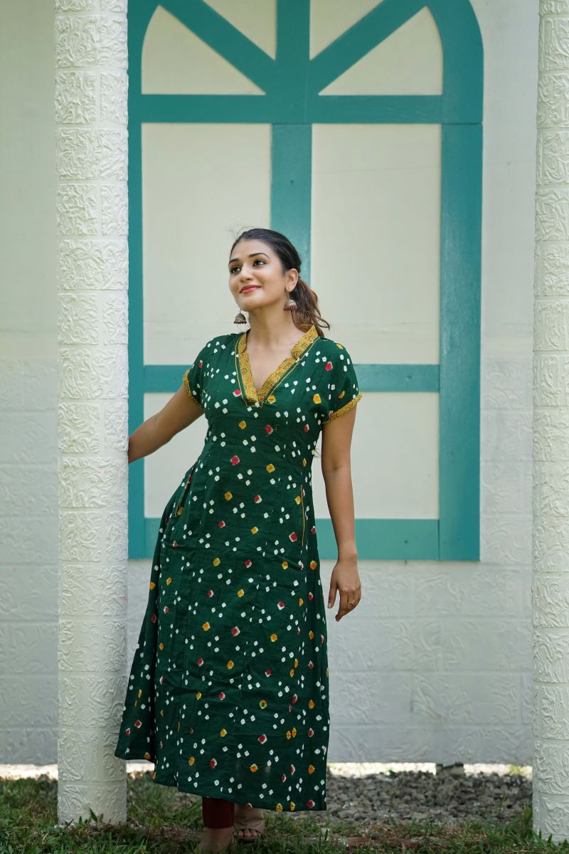 - Bandhani Cotton V-collar Paneled A Line kurta with Mega Sleeves and Pockets, Bottle Green, KP1092